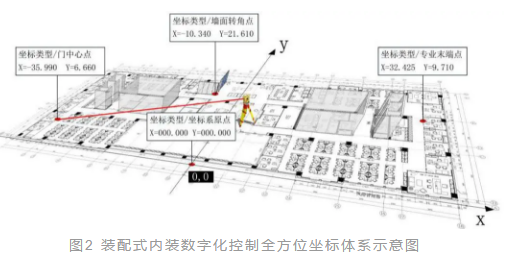 装配式装修工程中的部品设计、加工与装配对深化设计图纸和施工现场关键尺寸有全面精准的要求,装修的尺度关系、各专业与装修的关系、末端的定位等都需要提前汇集在装修施工前在深化设计图纸上,并通过有效途径落实到建筑实体中,再将装配式部品构件等精准的在施工现场组合装配,这个过程需要一种精确的全方位具有坐标定位的体系进行把控,将装修楼层平面坐标化,把装饰面完成线关键点进行坐标转换,把装修的天花板、墙板、地板、门窗、橱柜、设备末端等的关键点调入坐标系中,创建全方位坐标体系,统筹装修专业内部以及与其他专业之间的关系,为装配式装修工程控制与管理提供有力的技术支撑。